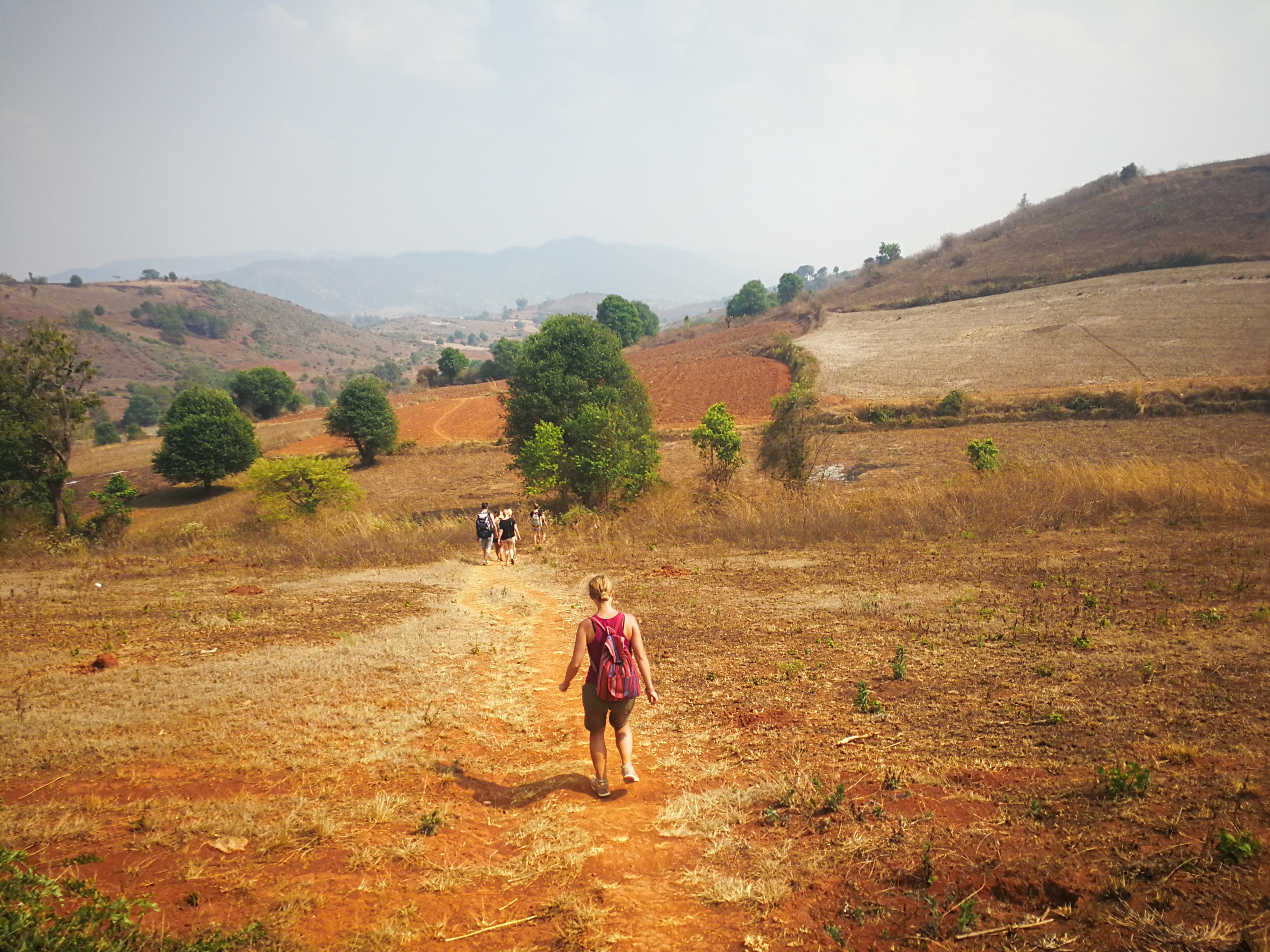 Po południu przyszedł czas na zarezerwowanie naszego trekkingu nad jezioro Inle. W Kalaw jest mnóstwo agencji, które organizują owe wyprawy – jest w czym wybierać. My, wraz z chłopakiem poznanym podczas wypożyczania rowerów oraz jego dwiema koleżankami Niemkami, udaliśmy się do Ever Smile. Polecam ich usługi, jeżeli macie ograniczony budżet i nie przeszkadza Wam liczna grupa. Jest to najtańsza opcja w Kalaw, dlatego też dużo backpackersów decyduje się na trekking właśnie z nimi. Następnego ranka wstawiliśmy pod Ever Smile, zwarci i gotowi na wędrówkę. 🙂 A wraz z nami 30 innych osób, które również zjawiły się pod agencją. Na szczęście podzielili nas na dwie grupy i tak oto wyruszyliśmy na nasz 2-dniowy trekking. Większe plecaki z całym naszym dobytkiem miały zostać dowiezione do jednego z hotelów nad jeziorem Inle, mieliśmy więc ze sobą tylko najbardziej potrzebne rzeczy. Naszym przewodnikiem była młoda kobieta, która, jak się okazało, wyczekiwała potomstwa. Pierwszego dnia zatrzymaliśmy się w wiosce grupy etnicznej Pa’O. Jak dla mnie była to trochę niezręczna sytuacja – wtargnięcie do czyjejś wsi i podglądanie ich życia, jak w jakiejś nowoczesnej wersji Big Brother’a. Miałam wrażenie, że wszystko było „na pokaz”, bardzo mało było w tym wszystkim autentyczności. Starsza przedstawicielka grupy siedziała sobie na ziemi i dziergała chusty, które oczywiście można było sobie sprezentować. Dzieci biegały po wiosce i wyciągały do nas rączki, szepcząc: „Money”. Jest to rzadko spotykany obraz w Mjanma, ale jak widać, tutaj również dotarła masowa turystyka, a wraz z nią zły wpływ na lokalną ludność. Nawet jeżeli myślisz, że pomagasz tym istotom, wrzucając im do rączki dolara, tak naprawdę wyrządzasz im tylko krzywdę. Lepszą formą pomocy jest zaangażowanie się w różnego rodzaju wolontariaty i akcje charytatywne.